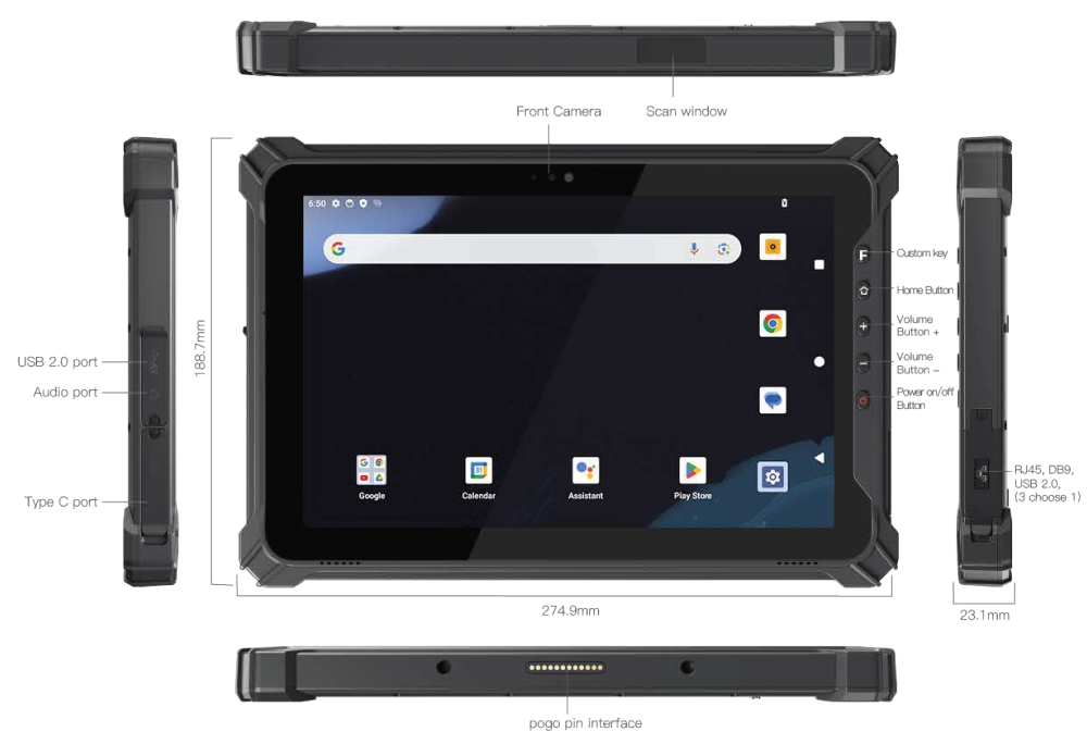 | I/O | USB 2.0 Type-A x 1, USB Type-C x 1, SIM Card x 2, TF Card (Three in one card holder), 12-PIN Pogo Pin x 1, Φ3.5mm standard earphone jack x 1 |