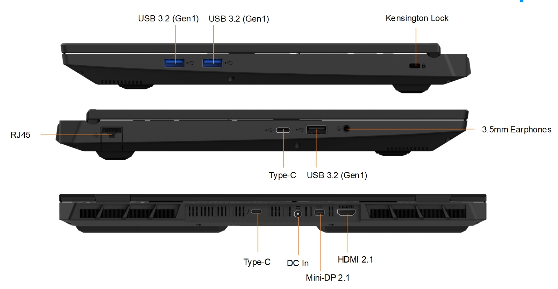 | IO Ports | USB port | USB-A (3.2Gen1, 5Gbps)@Left x1 USB-A (3.2Gen1, 5Gbps)@Right x2 USB-C (TBT4, 40Gbps+PD100W)@Rear x1*(support 140W) USB-C (3.2Gen2, 10Gbps+DP1.4+PD100W)@Left x1 |